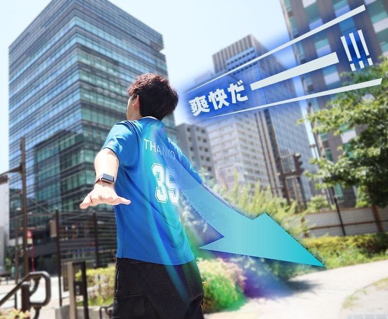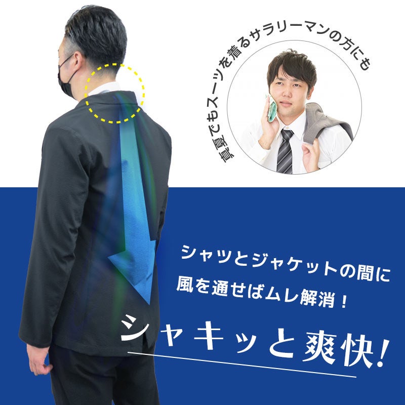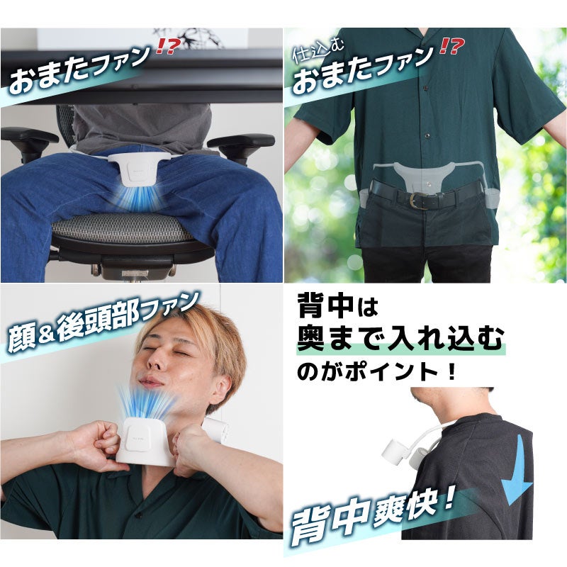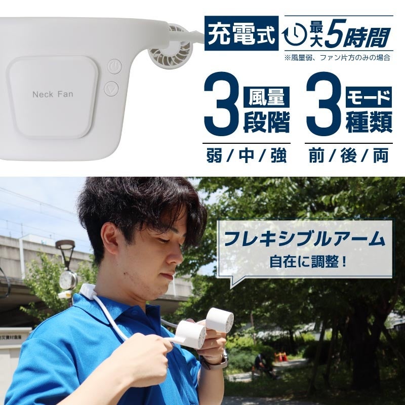 首にかける本体部の後ろ側にファンを搭載、服のエリの部分の中に入れて使用。ファンを回すと背中部分に風が通り抜けて蒸れやすい背中に風が送れます。さらに本体の左右から伸びるフレキシブルアーム部(22cm)の先端にそれぞれファンを搭載。自由に曲げて好きな位置でファンをセットできます。背中側のファンを前部分にして服の中に風を入れこんだり、左右のファンを脇に向けたり、様々な使い方が可能。