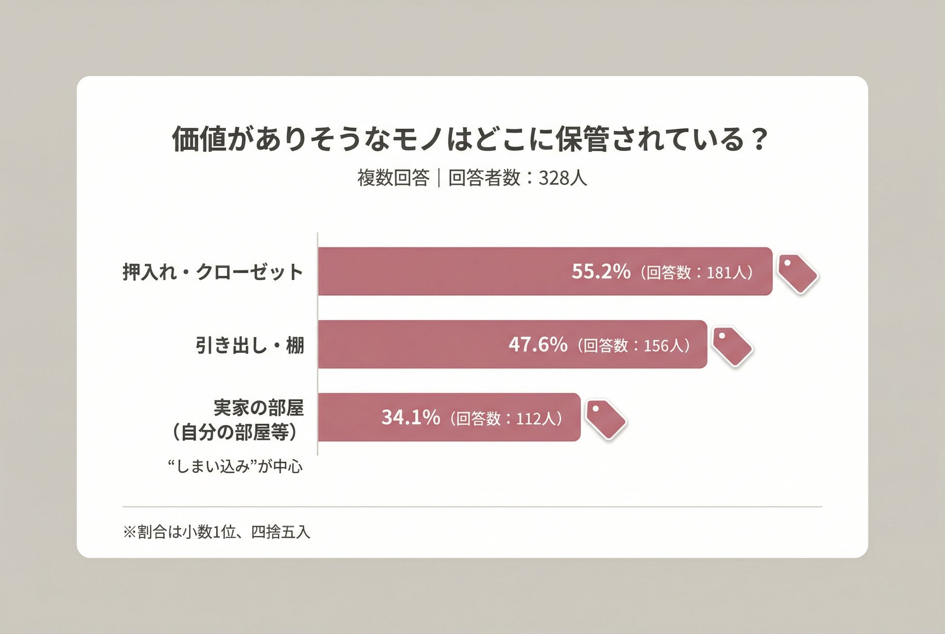 保管場所は押入れ・クローゼットが最多で、実家に置いたままの人も一定数。さらに、半数以上が調べようと思ったことがある一方で、調べ方が分からない、時間がかかりそう、相場が分からないなどが壁になりやすいことが分かりました。