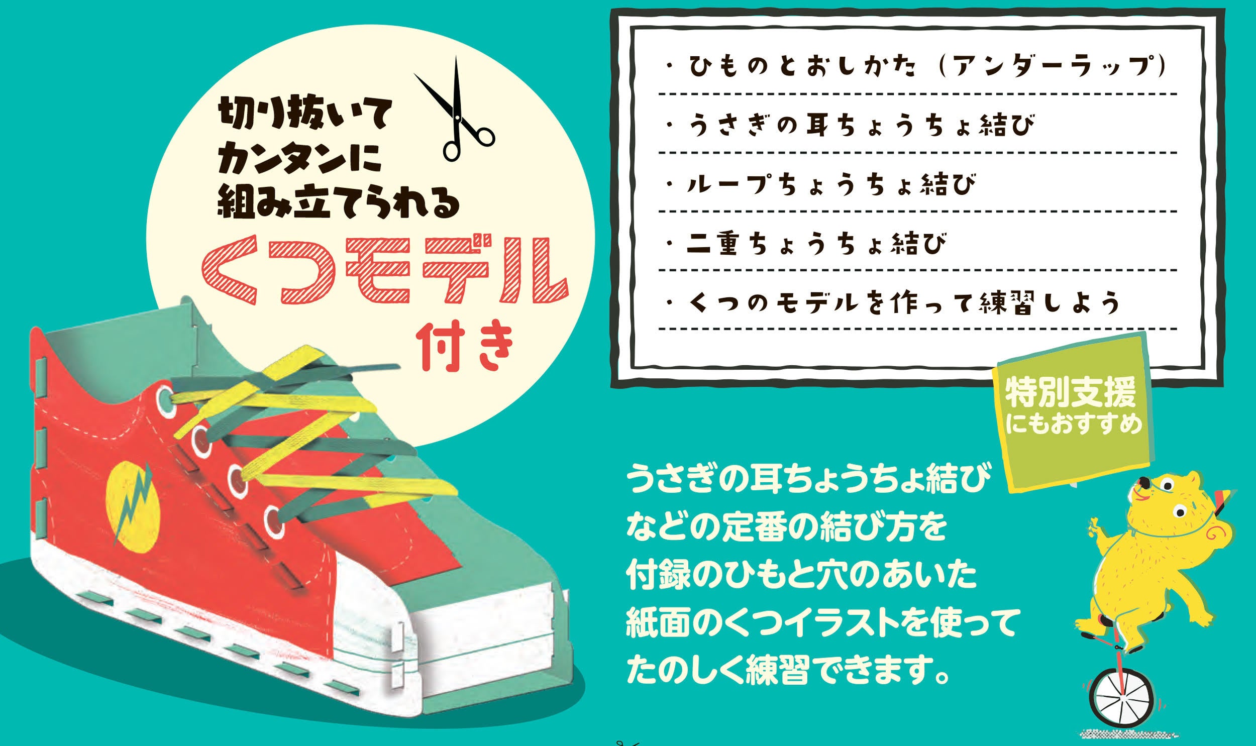 もっとも簡単で定番のくつひもの通し方と結び方を、付録のひもと穴のあいた紙面のくつイラストを使って練習できる絵本。簡単に組み立てられる付録のくつモデルを使って、リアルな練習もできます。