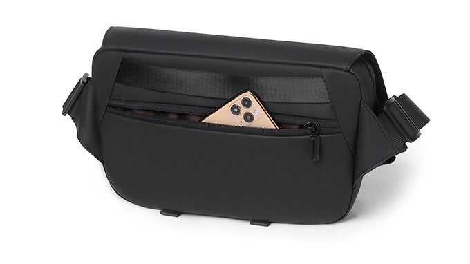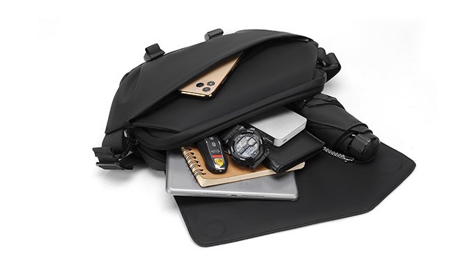 横型の設計で左右に大きく開くので、スマホやiPad、モバイルバッテリーなどものをすべて入れても、余裕のあるサイズ感で装着感を損ないません。