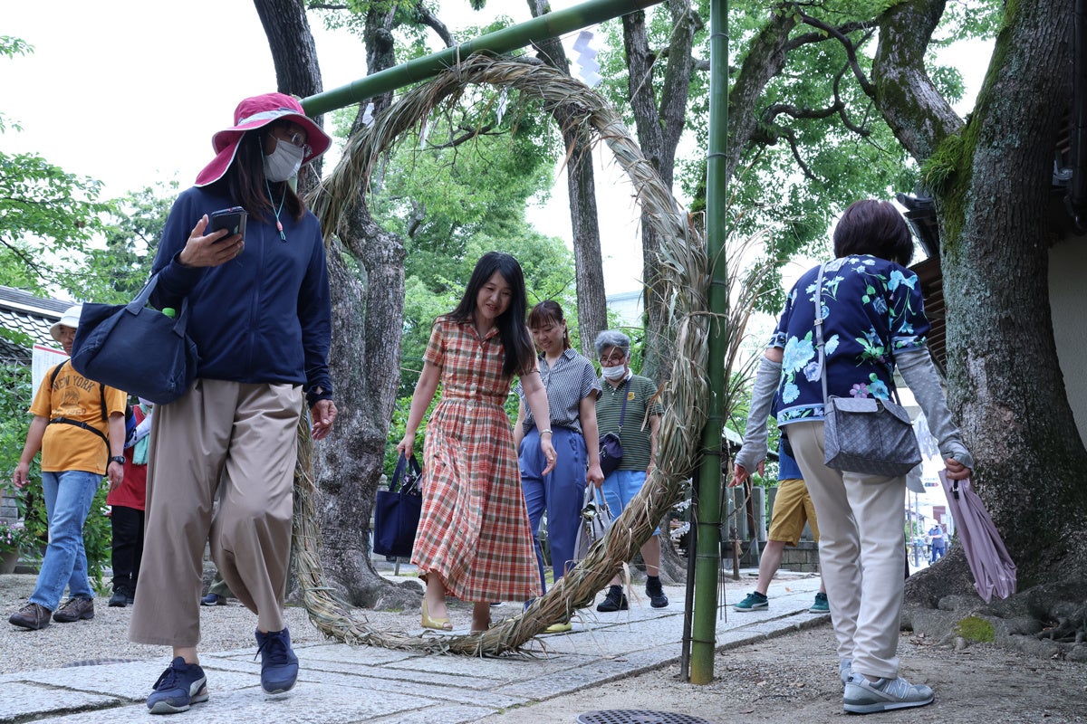 6月28日(水曜日)には、高槻市観光協会が実施する体験交流型のイベント「オープンたかつき」のプログラムの一つとして企画された高槻城の歴史を学ぶツアー参加者が茅の輪くぐりを体験。野見神社の福本章一郎宮司から神社の由緒などの説明を受けた後、「水無月の夏越の祓へする人は千歳の命延ぶというなり」と唱えながら境内に設置された直径2メートルほどの茅の輪を左回り、右回り、左回りと8の字を描くようにくぐりました。参加者は、「茅の輪くぐりをするのは初めて。貴重な体験ができた」と話しました。
