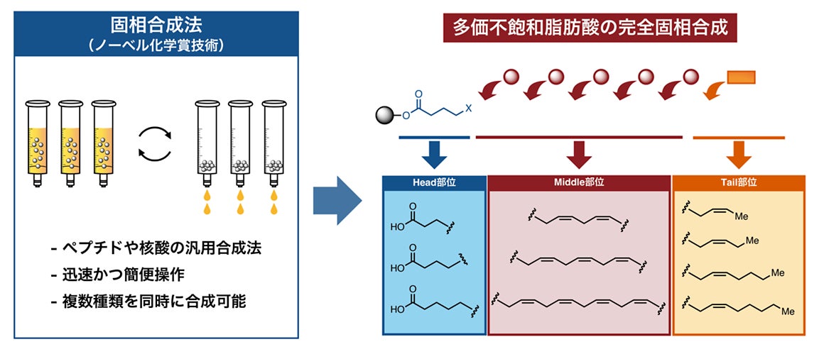 この度、本研究チームはペプチドや核酸などの生体分子の汎用的な化学合成法である固相合成法に着想を得て、世界で初めて多価不飽和脂肪酸の完全固相合成法を開発しました。固相合成法は、一般的な有機合成手法である液相合成法(注3)とは異なり、反応・精製操作が迅速かつ簡便であり、多種多様な分子を一挙に合成する並列合成に長けた手法です。元々はペプチドの合成法として開発され、その後、核酸や糖鎖の合成にも応用されており、その有用性から1984年にノーベル化学賞が授与されています。現在では、ペプチドや核酸の自動合成に展開されて実験室レベル・産業レベルで広く実用化されています。一方、固相合成法が得意とするのは、ペプチドや核酸のように、共通の分子構造(モノマー)が規則的に連続している高分子(オリゴマーまたはポリマー)であり、このような分子形態ではない多価不飽和脂肪酸では、完全固相合成法による合成は実現されていませんでした。従来の合成法では1種類の多価不飽和脂肪酸を合成するために数週間〜数ヶ月が必要でしたが、今回開発された手法によって複数種類の多価不飽和脂肪酸を同時に数時間〜数日で合成することが可能になりました。