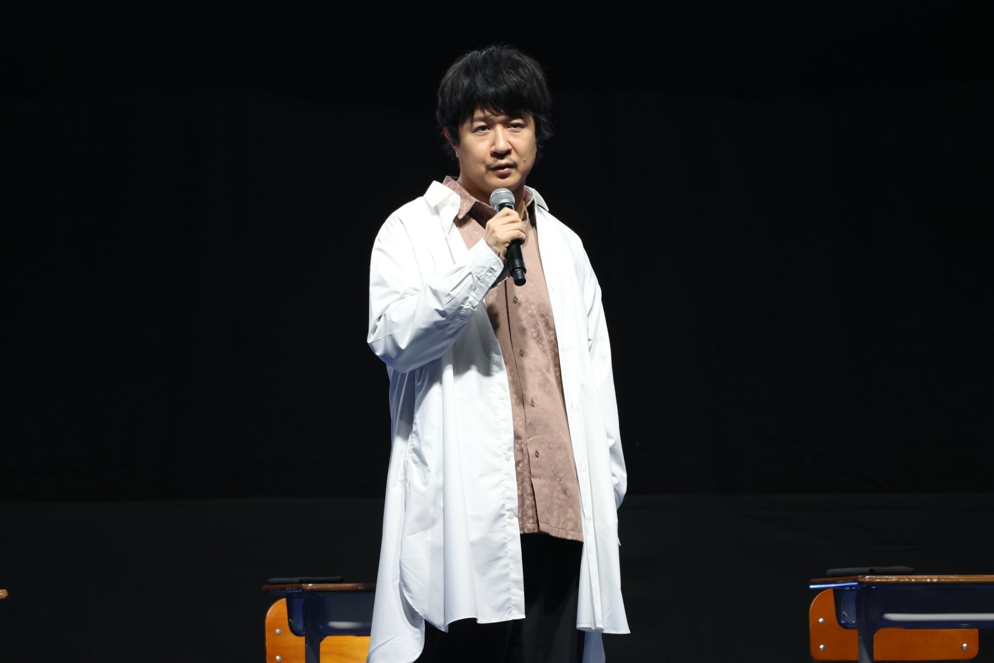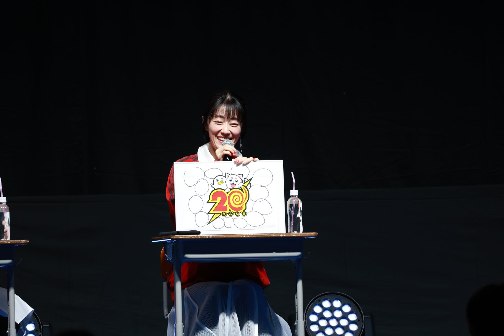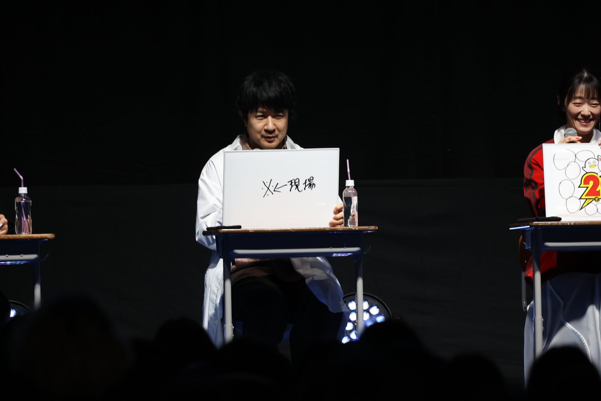 イベントのオープニングでは、登壇者の3人が『3年Z組銀八先生』でのキャラクターである坂田銀八・志村新八・神楽として影ナレーションを担当。銀八からの「はーい、皆さんが静かになるまで3分かかりました。」という学校の先生あるあるセリフで会場を沸かせたあと、教室をイメージしたステージに3人が登場しました。ステージ上では阪口さんが日直として進行役を務め、「起立!礼!着席!」の号令でイベントがスタートしました。