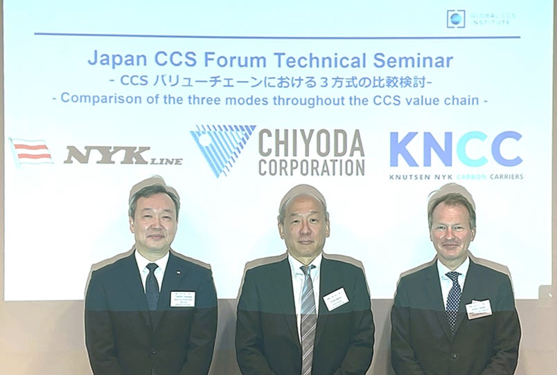 当社は千代田化工建設株式会社(以下「千代田化工」)、当社関連会社のKnutsen NYK Carbon Carriers AS (クヌッツェン・エヌワイケイ・カーボン・キャリアーズ、KNCC社)と、3方式それぞれについて、液化CO2の一時貯蔵などを行う陸上設備と海上輸送部分を通したCCUSバリューチェーン全体の定量的な比較検討を実施しており、当社の講演はこの検討結果を踏まえたものです。