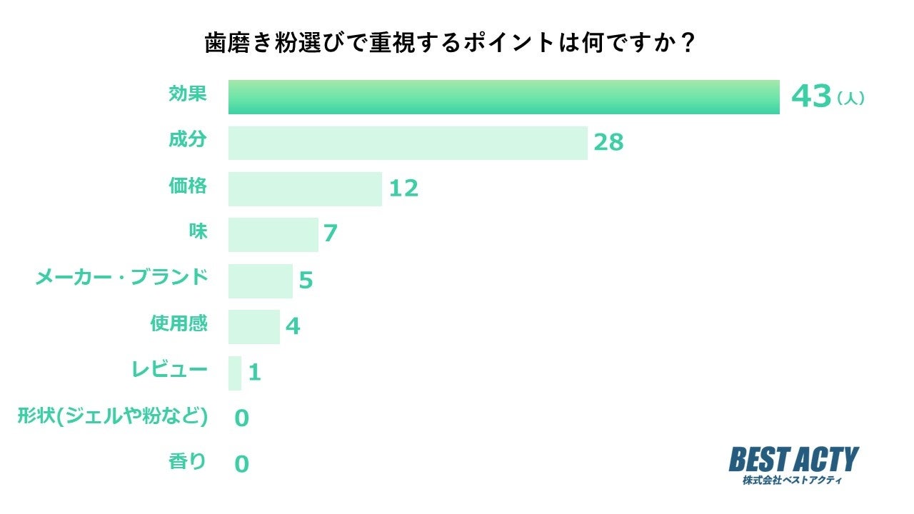 歯磨き粉選びで重視するポイントについて100人にアンケートを行ったところ、「効果」と回答する人が最も多い結果となりました。