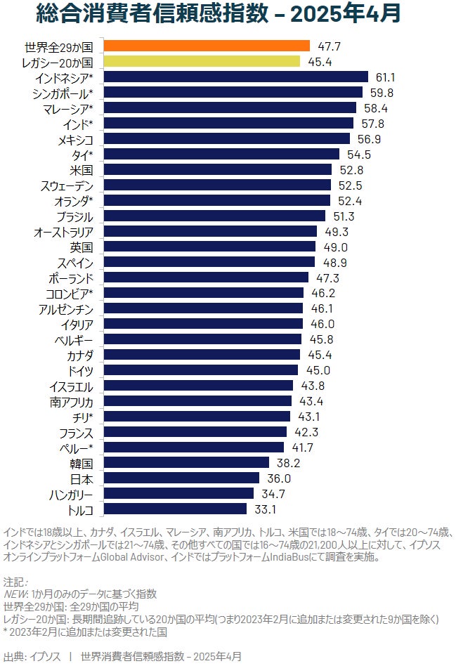世界最大規模の世論調査会社イプソス株式会社(日本オフィス所在地:東京都港区、代表取締役:内田俊一)は、日本を含む世界29か国の75歳未満の21,000人以上を対象に実施された月次調査「イプソス世界消費者信頼感指数 2025年4月」を公開しました。