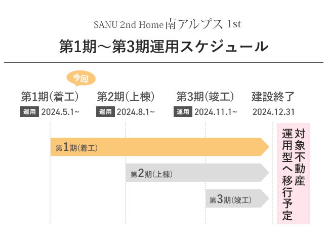 そして今後は第2期(建物の上棟~売却)と、第3期(建物の竣工~売却)として、それぞれの期間でファンド組成することを計画しており、最終的に完成した対象不動産を運用型ファンドへ移行することを予定しています。