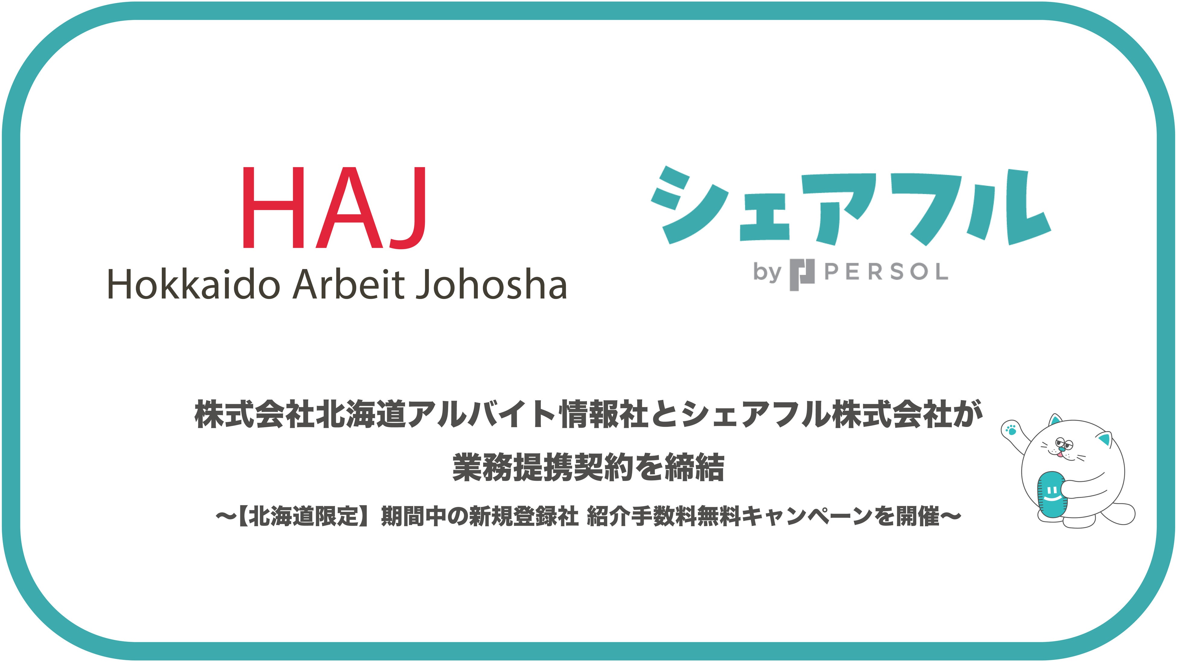 この度、株式会社北海道アルバイト情報社とシェアフル株式会社は、より北海道に根ざしたお客さまへのサービス向上、北海道における人材不足問題の解消のため業務提携契約を締結いたしました。