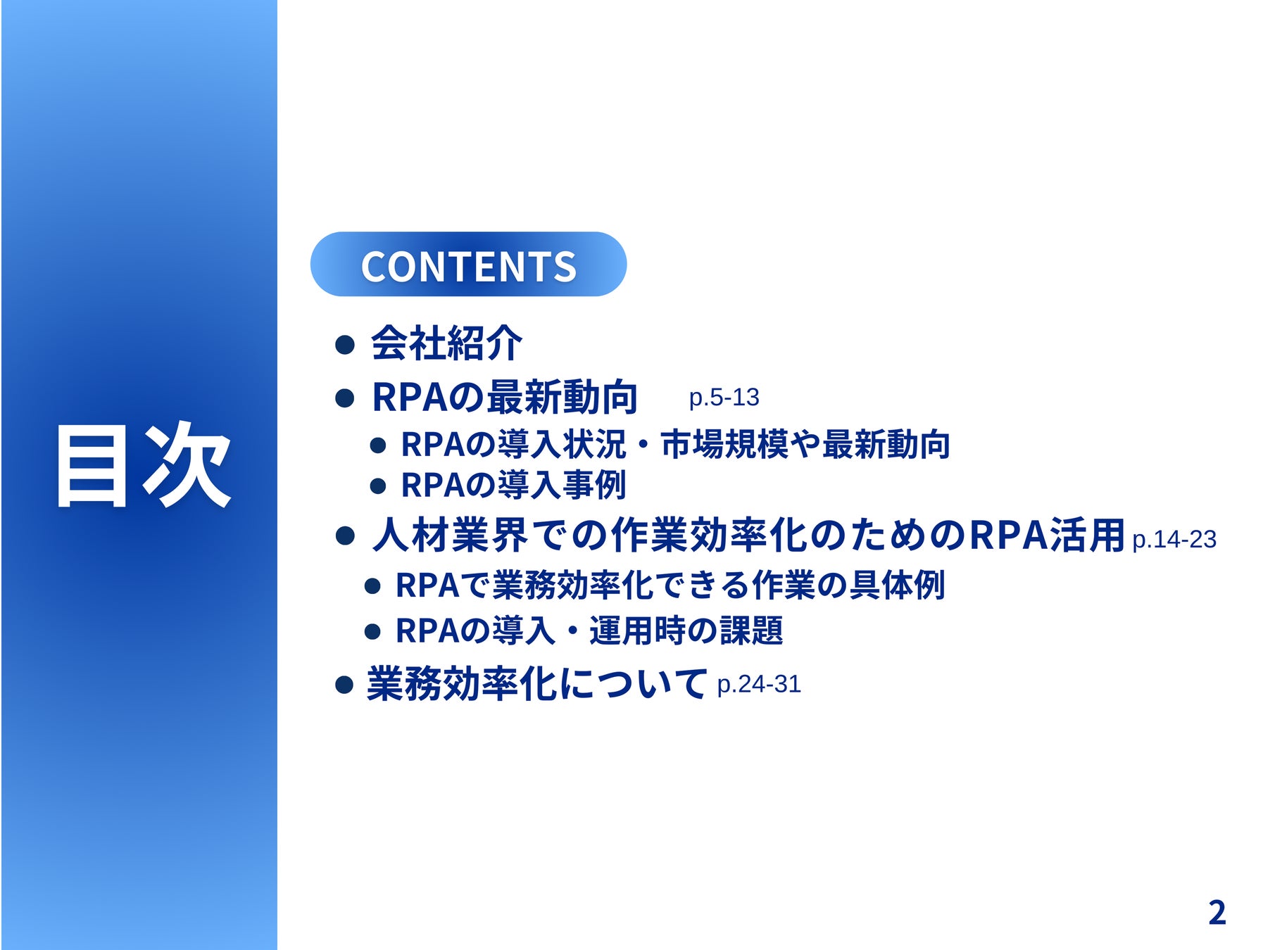 本レポートを通じて、RPAの導入事例や導入・運用時の課題などRPAに関して幅広くご理解いただけます。
