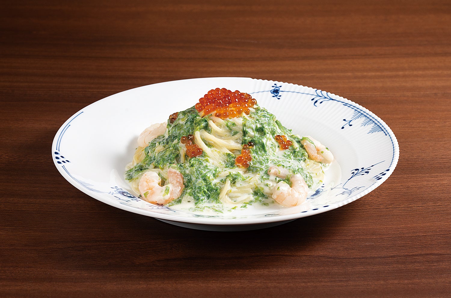 生海苔の風味豊かなクリームソースに、いくらと海老を贅沢にトッピング。海の幸をたっぷりと味わえるパスタに仕上げました。磯の香りがふわりと広がるパスタをお楽しみください。