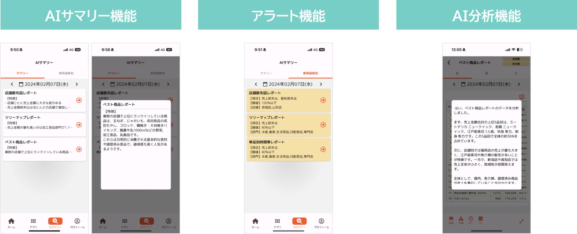 スマホで分析結果を見ることができるサービスです。売上状況のサマリーをテキストで自動的に表示するAI機能を搭載しているため、分析に要する時間が削減できます。また設定した数値に対する異常を検知する機能も搭載しているため、数値の変化を素早く察知できます。