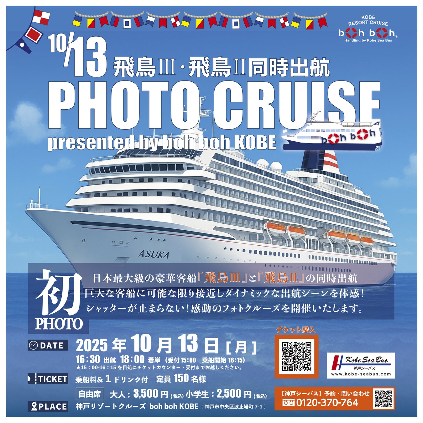 神戸シーバスboh boh KOBEは、10月13日(月・祝に)「飛鳥Ⅲ 飛鳥Ⅱ出航お見送りクルーズ」を開催いたします。