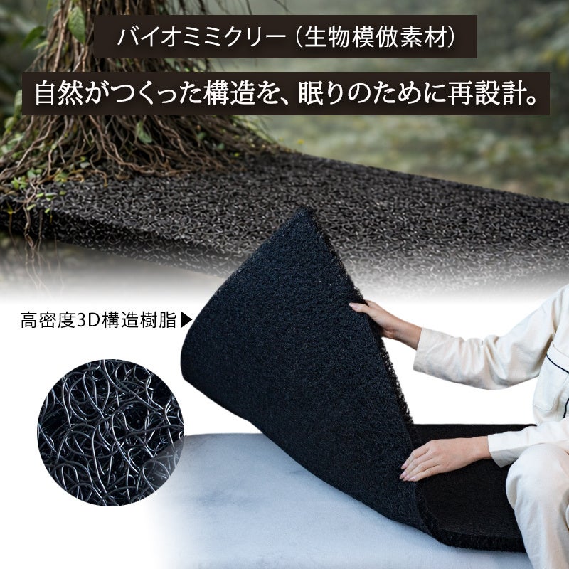 本商品に採用されたのは、植物のツタが「絡まり合う構造」を模したバイオミミクリー素材。既存の寝具にプラスするだけで沈み込みを抑え、強固な支持力で身体を支えるのが大きな特徴です。なお、発売に先駆け、現在は予約販売の受付を開始しております。