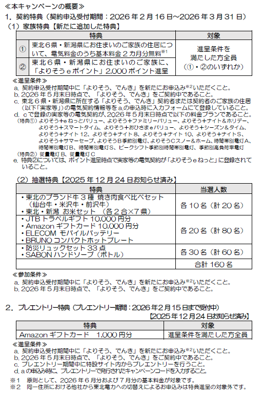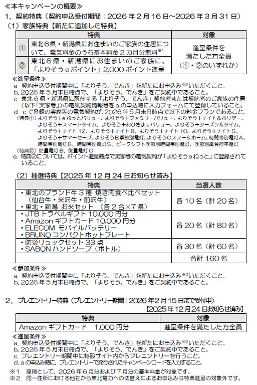 本キャンペーンは、契約申込受付期間中(2026年2月16日から2026年3月31日)に首都圏向け電気料金プラン「よりそう、でんき」に新たにご加入いただいたお客さまを対象に、抽選で新生活応援賞品をプレゼントし、さらに、2026年2月15日までに事前にプレエントリーをいただいた方には、もれなくAmazonギフトカード(1,000円分)をプレゼントするものです。(2025年12月24日お知らせ済み)