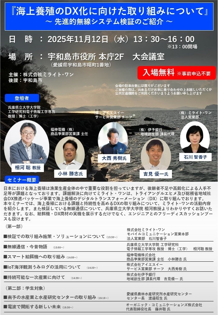 また、本セミナーは、兵庫県立大学大学院をはじめとし、全7社・団体にて開催され、海上養殖事業者および愛媛県内の学生(大学生及び高校生)を対象としています。ミライト・ワンは「検証での取り組み施策・ソリューション」についてを講演予定です。
