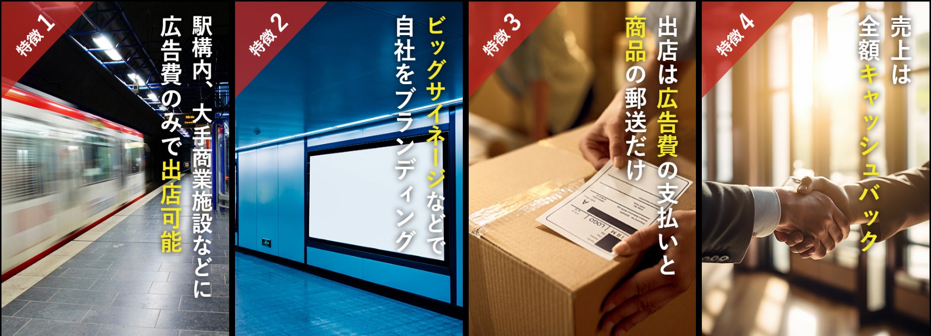 デジタルサイネージ広告による効果的なプロモーションや、売上還元など、出店者の負担を最大限軽減し、販売促進を強力にサポートします。
