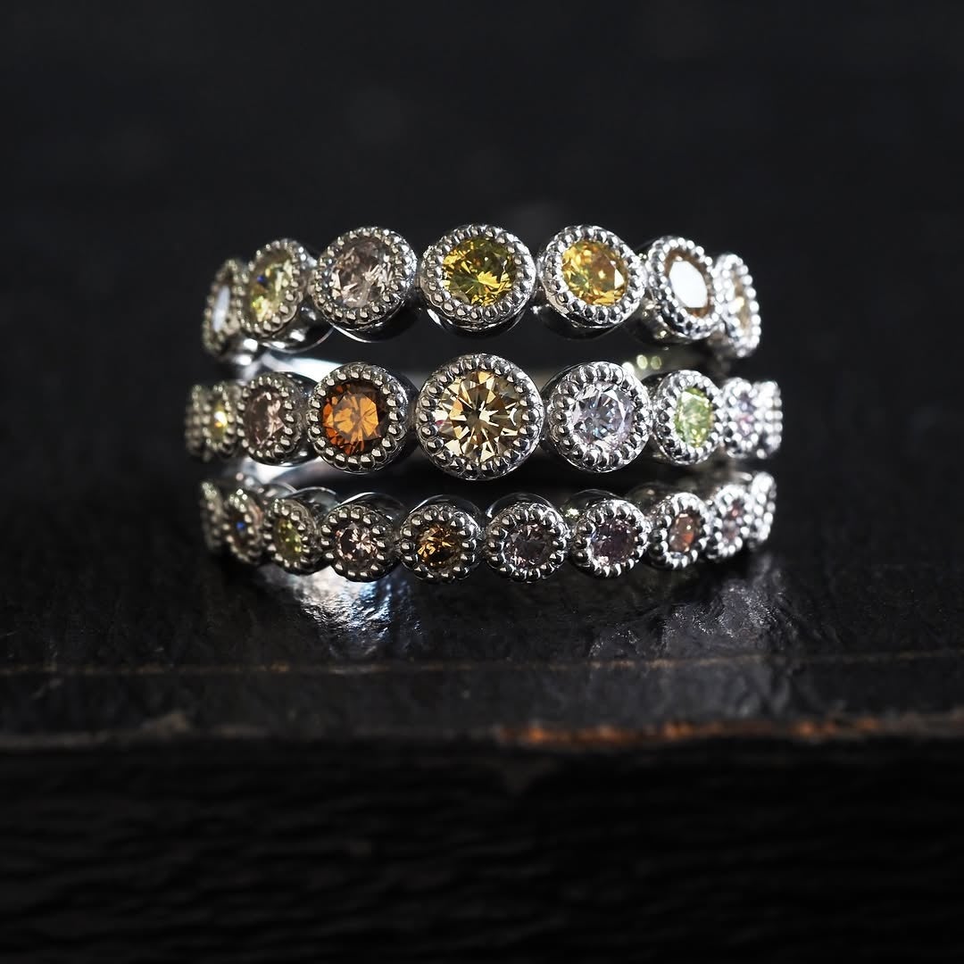 本作では、その中でも特にカットが美しく厚みのあるものを厳選。VSクラスの高品質のホワイトをはじめ、ナチュラルカラーのイエローやブラウン、スノーホワイトなど、多彩な表情を持つダイヤモンドを取り入れています。リングのアームには、通常のポンポネとは異なる槌目加工を施し、さらにバフで滑らかに仕上げることで、溶けた水面のような柔らかい輝きを演出。繊細で可憐な4mmサイズのダイヤモンドと相まって、優雅さと親しみやすさを兼ね備えた仕上がりとなっています。