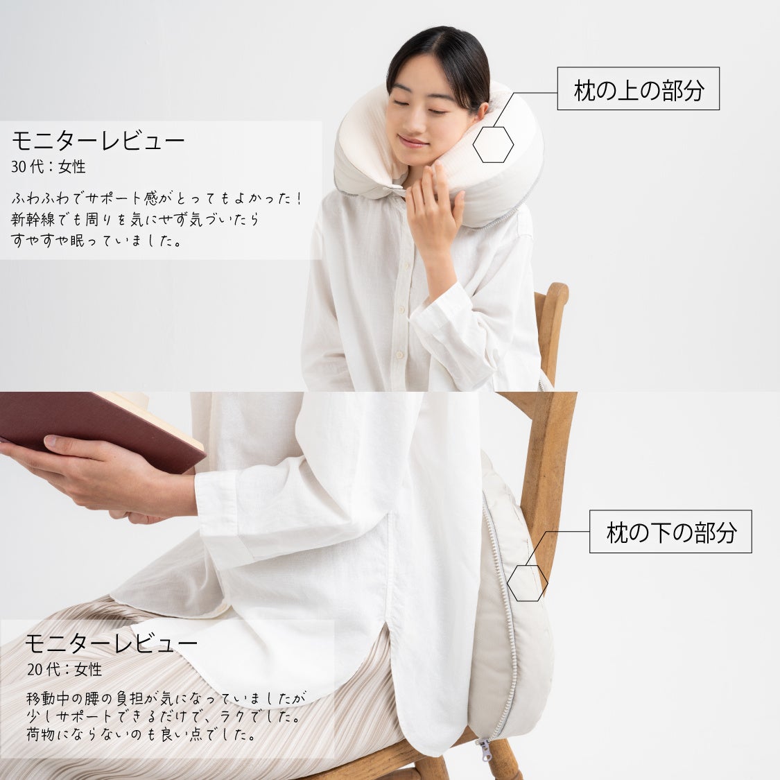 ブーメラン形状によって横向き姿勢でも頭や腕の位置が安定しやすく、自宅でのくつろぎ時間はもちろん、デスクでの仮眠や移動時の休息など幅広いシーンで活用できます。