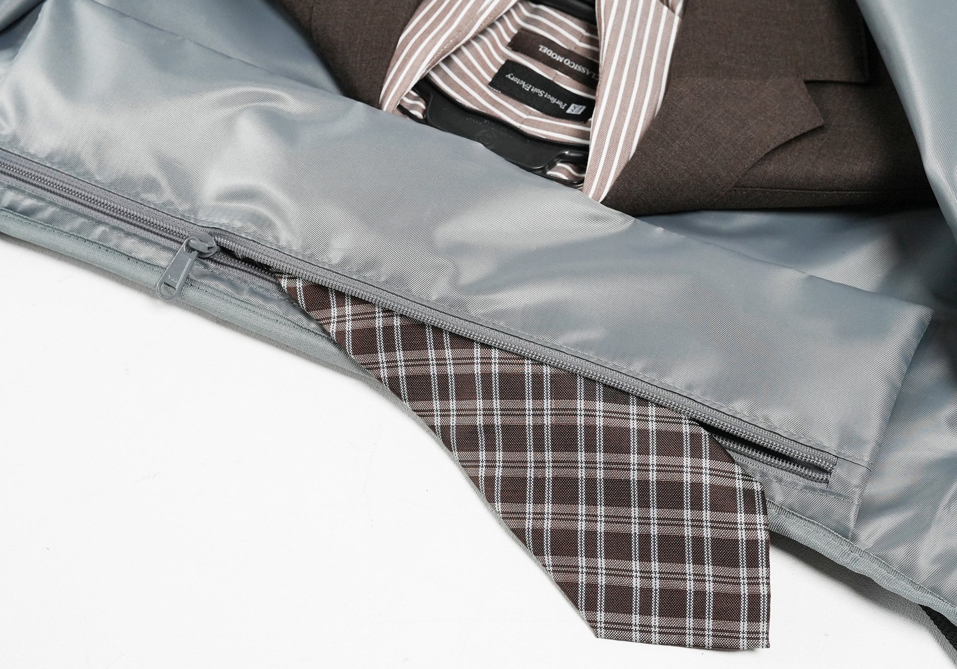 スーツの収納内部には「スーツ固定・吊り下げベルト」「中間止めベルト」「裾止めクリップ」の3点を装備。バッグの中でスーツがよれたり、ずれる事を防ぎ、移動中も美しいシルエットを保持します。ネクタイを収納する専用ポケットも完備されており、他の荷物に埋もれずシワなく持ち運べます。