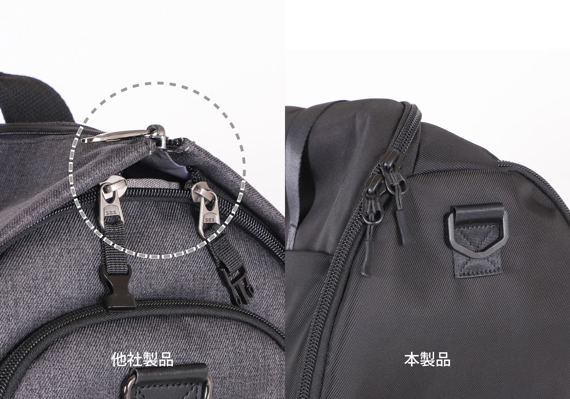 ジッパーを複数本使用せず一本型にすることで、組み立て時に発生する隙間が最小限となり、雨水やほこりなどの侵入を防ぎます。また全ジッパーにはYKKを採用しており、安心して長くご愛用いただけます。