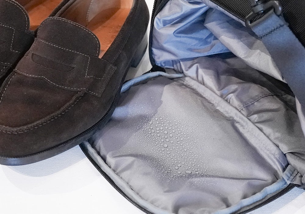 最大29cmの靴を収納可能。防水加工が施されているため、雨の日の靴やトレーニング後の濡れたウェアを、他の清潔な衣類と完全に分けて収納できます。