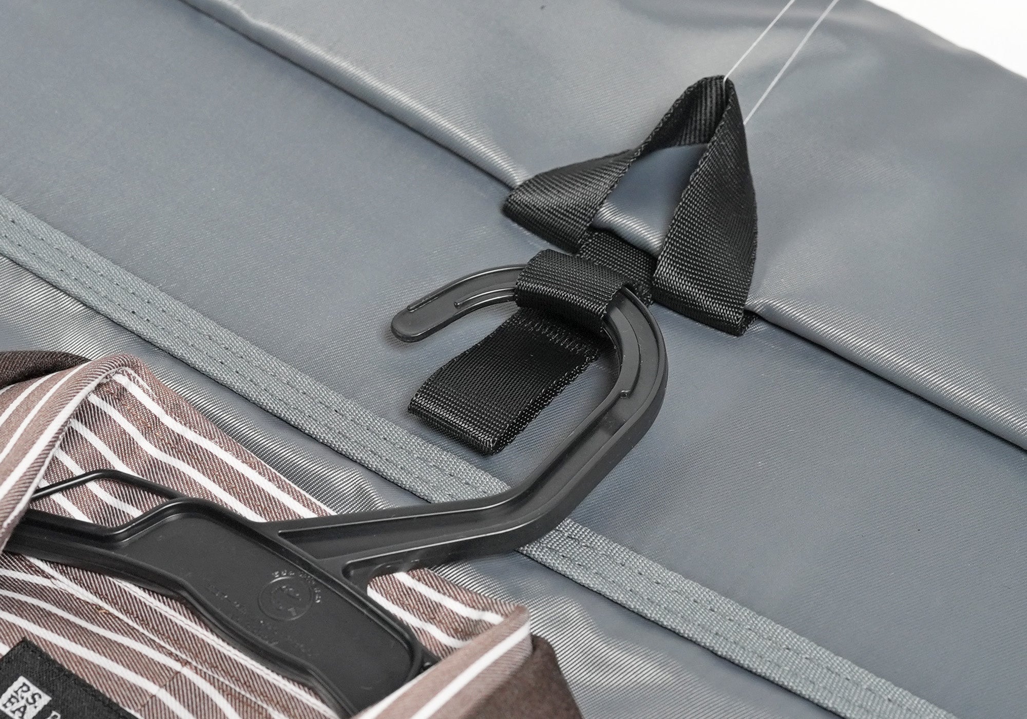 バッグを広げた状態でスーツをセットし、そのまま畳まず、包み込むようにバッグを形成。スーツを折り畳む必要がないため、目的地に到着してすぐに、アイロンいらずの綺麗な状態で着用可能です。また、ホテルのクローゼットにそのまま吊り下げて使用することもできます。