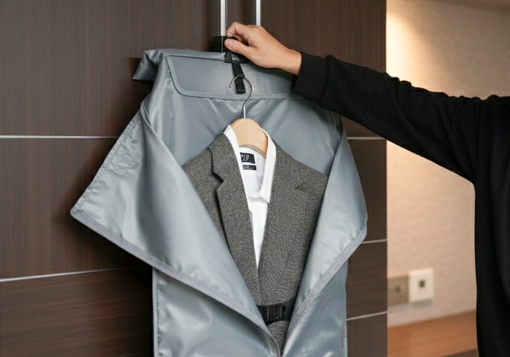 最大のメリットは、宿泊先での面倒なアイロン掛けを不要にすること。大事な商談の朝、限られた時間の中でシワを伸ばす作業は、ビジネスパーソンにとって大きな負担。折りシワの発生を抑え、すぐシワのないスーツを着用できる状態を実現。移動中の気遣いや、出先での無駄な準備時間を徹底的にカット。バッグから取り出すだけで、清潔感のある装いで最高のパフォーマンスを発揮できる。まさに時間を生み出すためのビジネスツールです。