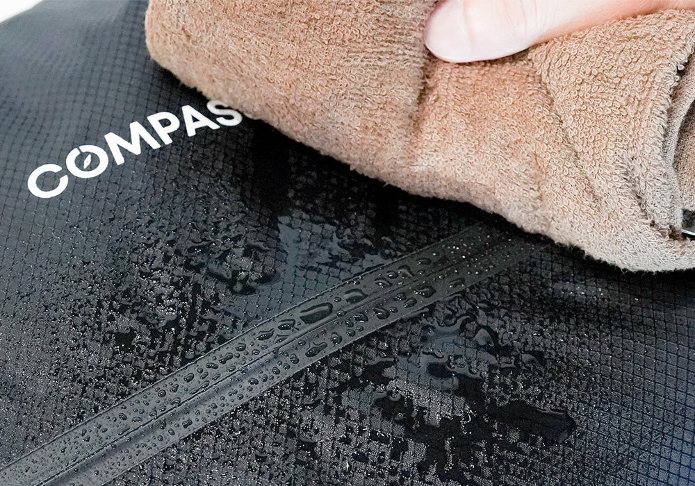 優れた防水性能を備えた高機能素材を採用。濡れた衣類や汗をかいたウェアも、周囲を汚すことなくそのまま収納可能です。水分や湿気を外に逃がさないため、旅行やアウトドアでの汚れ物入れや、ジム着入れとしてもオススメです。