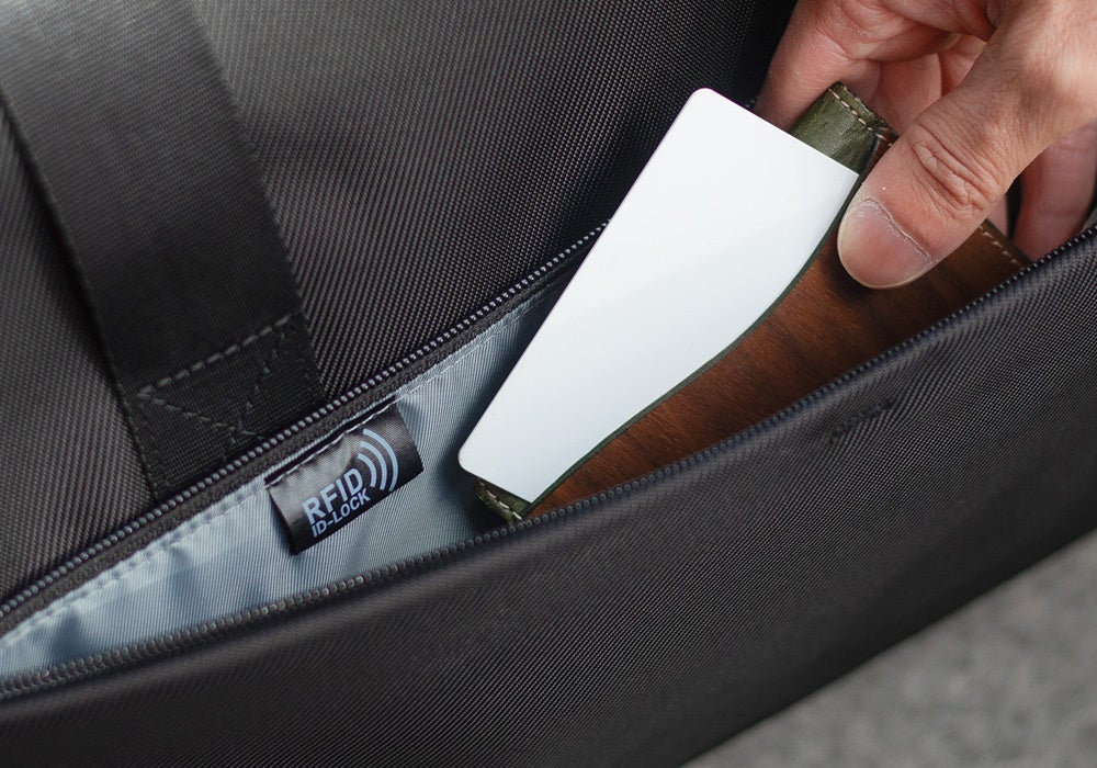 フロントポケットには、パスポートやクレジットカードのデータをスキミングから防ぐ、RFIDブロック機能を搭載。機密性の高いデータを守り、移動中もスムーズに中身を取り出せます。