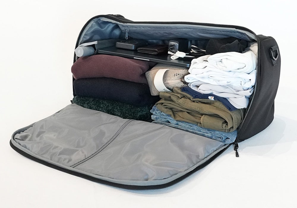 約3日分の荷物が入る大容量。パンパンに膨らんだバッグも、スーツケースの半分のサイズまで圧縮。(一般的な36Lスーツケースの半面に収まる設計)口が広いため、畳んだ衣類の出し入れにストレスがありません。