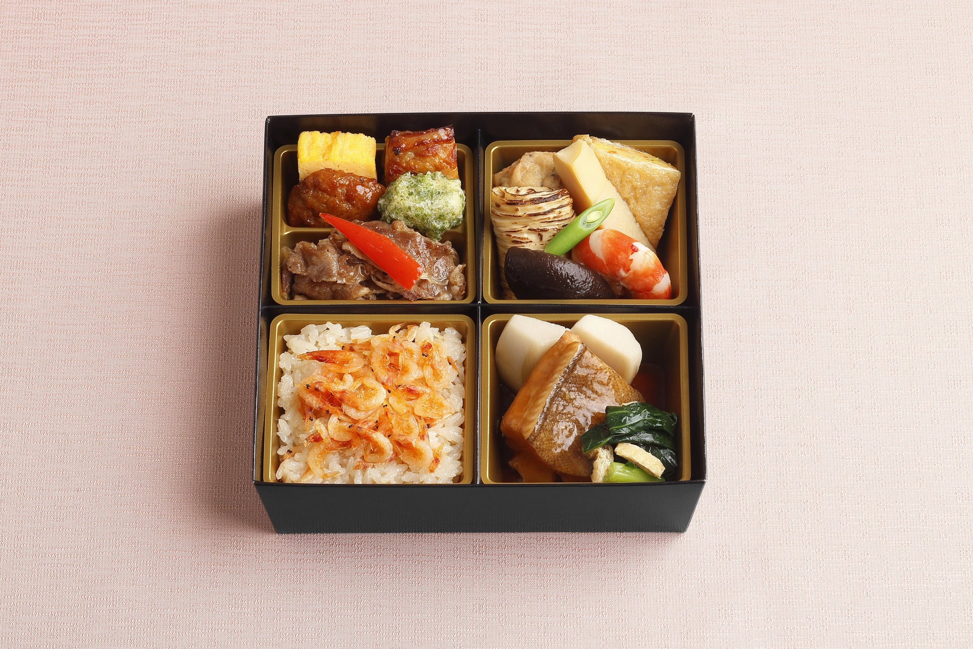 母の日弁当「謝意」は、料亭ならではの美味しさにこだわった贅沢な配送限定の弁当をご用意しました。メイン料理の「鰈煮付け」は厚みのしっかりした原料を使用し、じっくりと味を浸み込ませたこだわりの一品です。なだ万定番人気の「牛肉香味焼」や旨みが凝縮した「鶏味噌焼」の肉料理に加え、「海老芝煮」、「巻湯葉」、「筍含め煮」などの、なだ万ならではの出汁をきかせた煮物もお楽しみいただけます。香ばしく芳醇な「桜海老御飯」と共にご堪能ください。