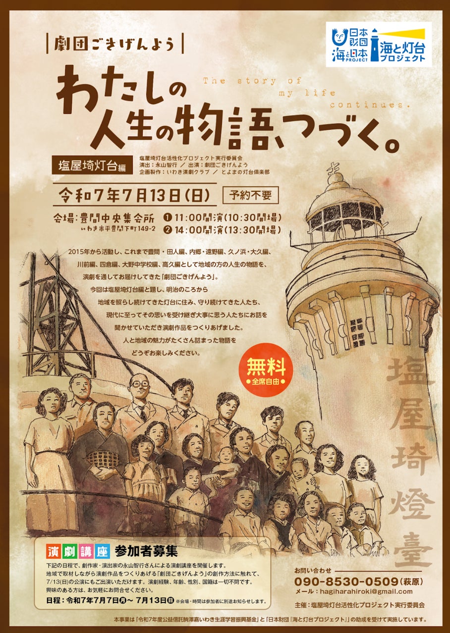 塩屋埼灯台活性化プロジェクト実行委員会(幹事社:いわき演劇クラブ)は、2025年7月13日(日)に、演劇公演「わたしの人生の物語、つづく。」塩屋埼灯台編を上演いたします。この公演は、日本財団「海と日本プロジェクト」の一環として、灯台を中心に地域の海の記憶を掘り起こし、地域と地域、異分野と異業種、⽇本と世界をつなぎ、新たな海洋体験を創造していく「海と灯台プロジェクト」の助成を受けて実施します。