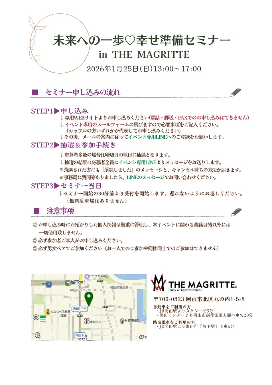 【岡山市出会いのひろば】参加者募集中!“未来への一歩♡幸せ準備セミナー in THE MAGRITTE” 1月25日(日)開催