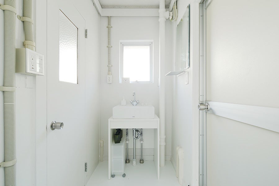 シンプルな洗面化粧台は、どんな空間にも合い、下のスペースを活用することで自由に収納を工夫できます。