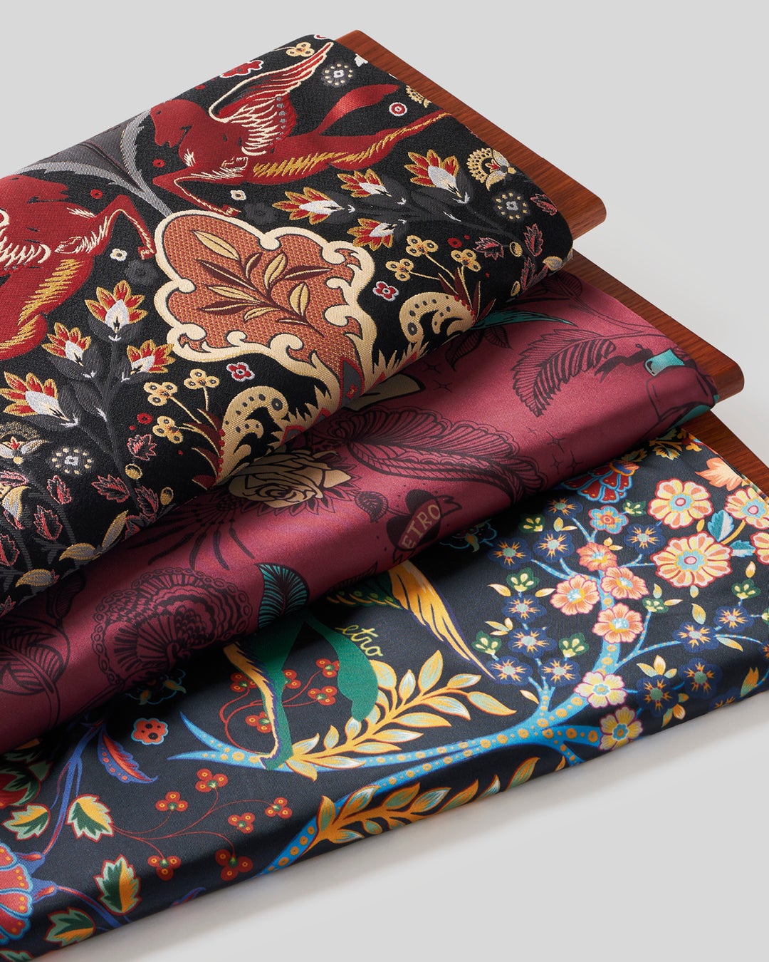 本サービスでは、エトロの貴重なアーカイブから選び抜かれた100種以上のオリジナリティあふれるファブリック、約50種のライニング、約30種のアンダーカラー(衿裏)、約50種のボタンを組み合わせて、お客様だけの「ユニーク」なガーメントを創造できます。さらに、エトロのファブリックに加えて、英・ドメール社、英・ホーランド&シェリー社、伊・ドラゴ社、伊・ピアチェンツァ社など、世界的な高級ファブリックメーカーの素材もラインナップされています。