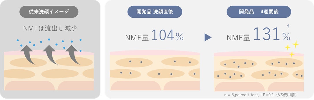 開発品の洗顔料を28日間連用(保湿のスキンケアをせず、洗顔料のみ)することで、NMF量(角層アミノ酸量)が131%に向上しました。通常、流出してしまいがちなNMFを、流出を抑えるだけでなく、洗顔するだけで増やすことが期待できると考えます。