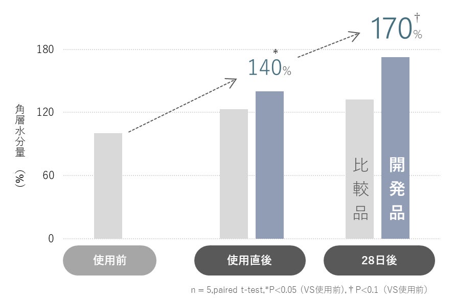 開発品の洗顔料を28日間連用(保湿のスキンケアをせず、洗顔料のみ)することで、素肌の状態で角層水分量が170%に向上しました。開発品を連用することで、NMF量が向上し、素肌の状態から潤う状態に変化することが考えられます。本結果に、スキンケアの効果が組み合わさることで、角層水分量はさらに向上することも期待できます。