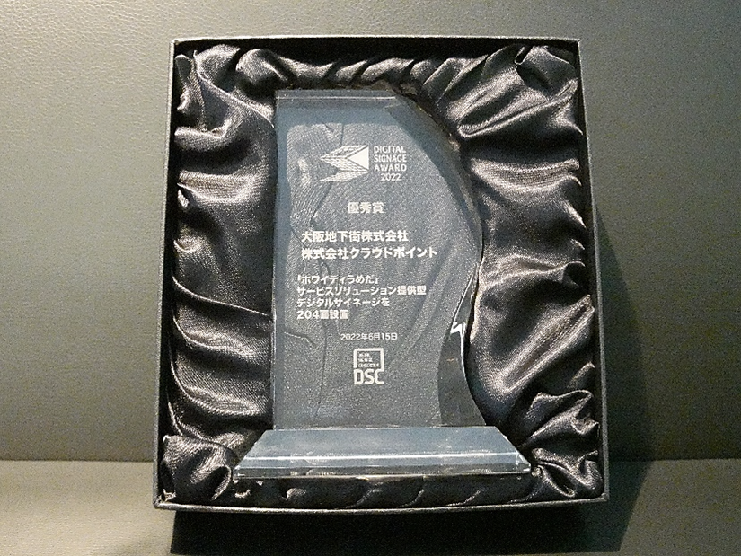 大阪市内の6地下街を管理・運営する大阪地下街株式会社(本社:大阪府大阪市、代表取締役:町野和道)と、株式会社クラウドポイント(本社:東京都渋谷区、代表取締役:三浦 嚴嗣、以下、クラウドポイント)は、この度「デジタルサイネージアワード2022」にて、優秀賞を受賞いたしました。