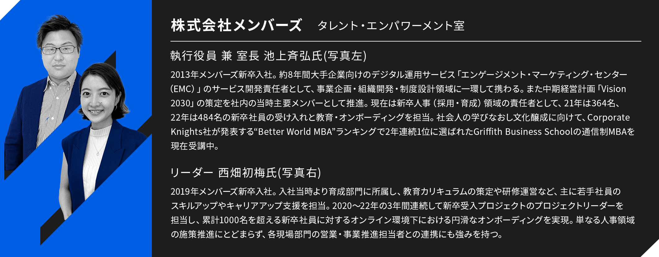 国内企業向けにデジタルマーケティング・ビジネスの運営支援事業を行うメンバーズでは、この数年で累計1,000名以上の新卒社員を採用し、専門スキルやマインド面の教育によって若手の主体的な成長と早期活躍を目指してきました。特にこの数年間は各事業部門の営業計画やサービス戦略との一貫性を意識した「オンボーディング」領域の強化に取り組んでいます。コロナ禍の影響を受け、オンラインを前提とする人事施策が求められる中、「人事担当者のあたかも出向」や「プロジェクト型集合研修」、「カンパニー長公募制度」等の具体的な取り組みや現状の課題感を皆さまにご紹介いただきます。