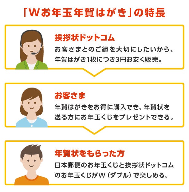 ご注文いただいたお客様は、年賀はがき1枚につき3円安く購入でき、年賀状を受け取られた方は、日本郵便のお年玉くじと、挨拶状ドットコムのお年玉くじの両方をW(ダブル)で楽しむことができます。