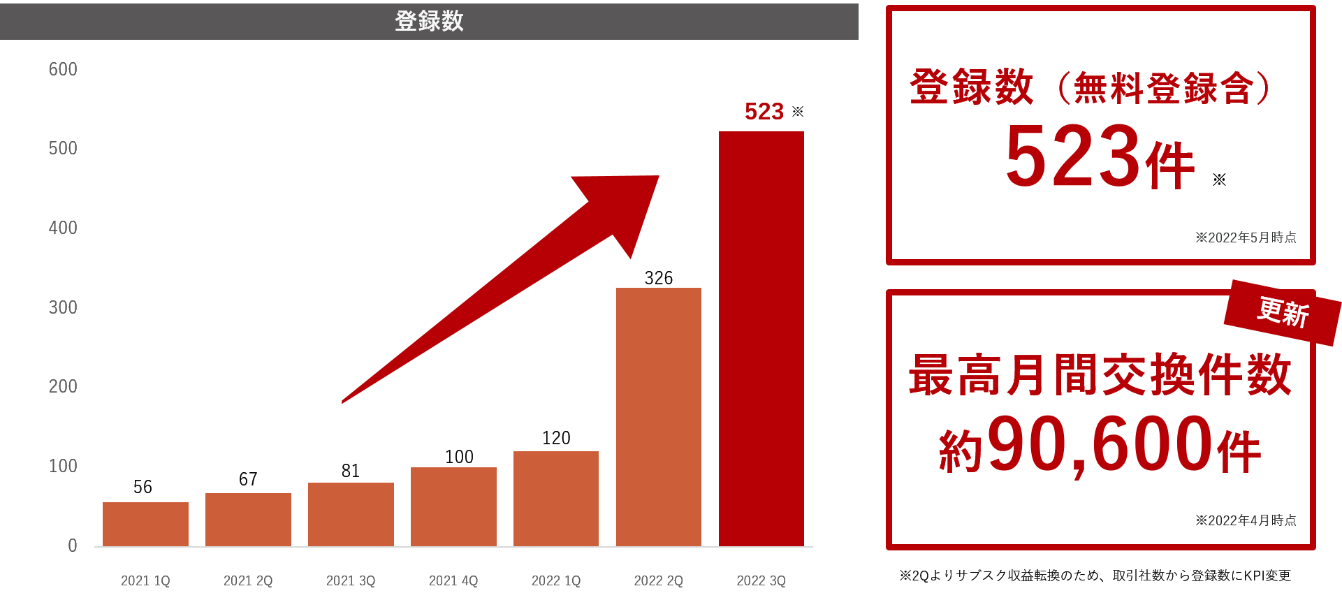 2022年度通期目標である登録数1,000件に向け、展示会への出展などサービス認知度向上を目的に営業活動を強化、来場者キャンペーンなどの施策が実を結び、第2四半期より登録数が大幅に増加、多くの企業様にご利用いただける結果となりました。登録数増加に伴い、トランザクション数も増加し、2022年4月に過去最高となる90,000件を突破することができました。