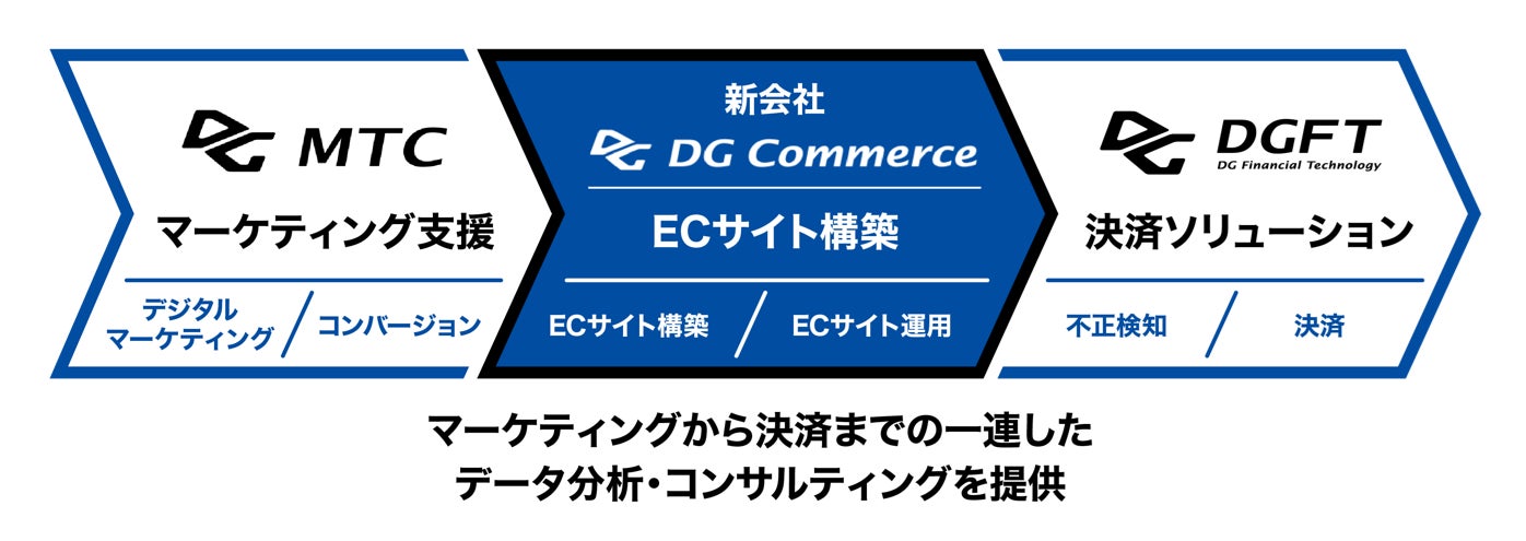 そこで今回、当社のE-Commerce事業を将来にわたって発展させ続け、EC市場において確固とした地位を築くことを目的に、EC運営事業者から求められるデジタルマーケティングや電子決済等の様々な機能やサービスをグループ会社に保有するDG社の子会社であるDGFT社と協同し、新会社「DGコマース」の設立を決定しました。