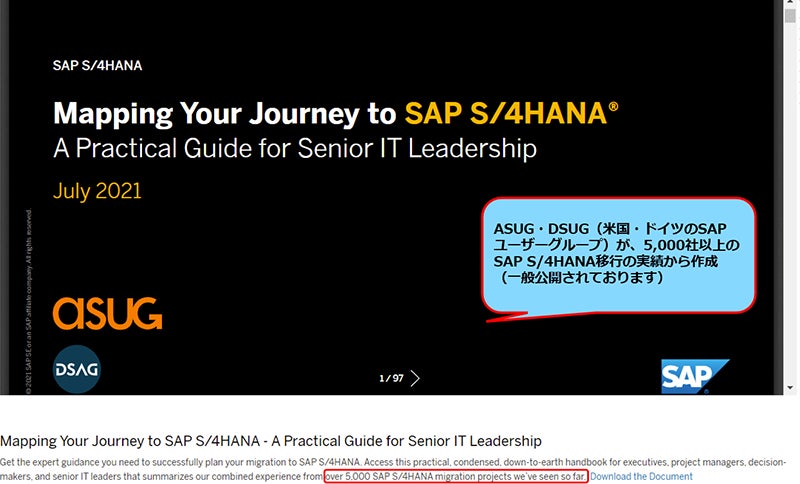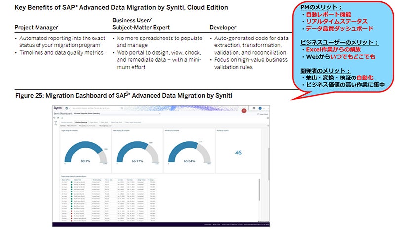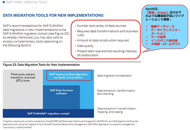 欧米のSAPユーザーグループのASUG(Americas' SAP Users' Group)およびDSAG(Deutschsprachige SAP-Anwendergruppe)が公開しているドキュメント(A Practical Guide for Senior IT Leadership)では、レガシーからの新規、SAP® ERPからグリーンフィールドや、複数データソース統合、データガバナンス向上、大規模ロールアウトプロジェクトなど、難易度の高いSAP S/4HANAデータ移行でSynitiが推奨されています。