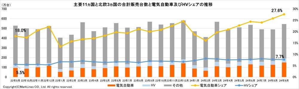 主要12カ国とノルウェー、スウェーデン、フィンランドの北欧3カ国(計15カ国)における9月の電気自動車販売台数は150.8万台だった。前年同月比で32.5%増と大きく伸び、前月比でも19.1%増加した。9月の電気自動車シェアは27.6%で、前年同月比では7.6ポイント増、前月から1.8ポイント増加した。2カ月連続で過去最高を更新している。1~9月の電気自動車累計販売台数は、前年同期比23.2%増の1,010.5万台で、自動車販売台数全体に占めるシェアは22.4%となった。