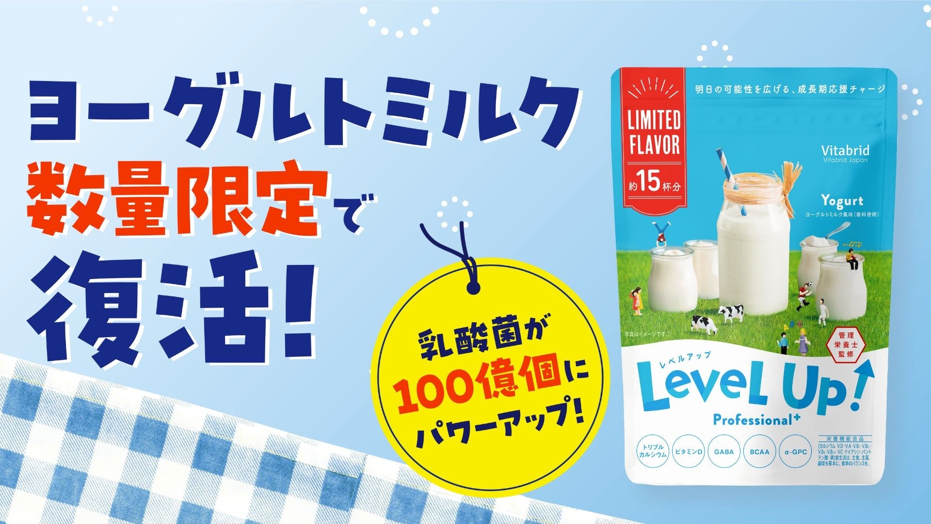 株式会社ビタブリッドジャパン(本社:東京都港区、代表取締役:大塚博史)は、子どもの成長期をサポートする栄養機能食品「レベルアップ プロフェッショナル プラス」シリーズにおいて、春夏にぴったりな新フレーバー『ヨーグルトミルク風味』を 2025年5月13日(火)より数量限定で販売開始いたします。