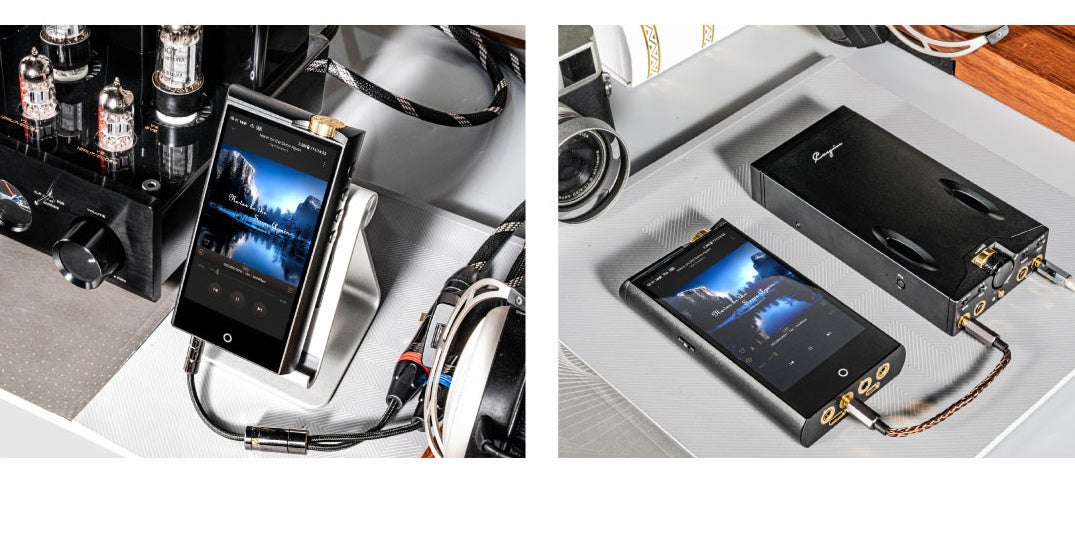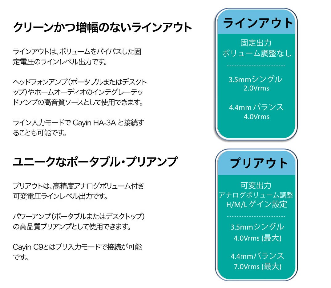 プリアウトは、高精度アナログボリューム付き可変電圧ラインレベル出力です。パワーアンプ(ポータブルまたはデスクトップ)の高品質プリアンプとして使用できます。Cayin C9とはプリ入カモードで接続が可能です。