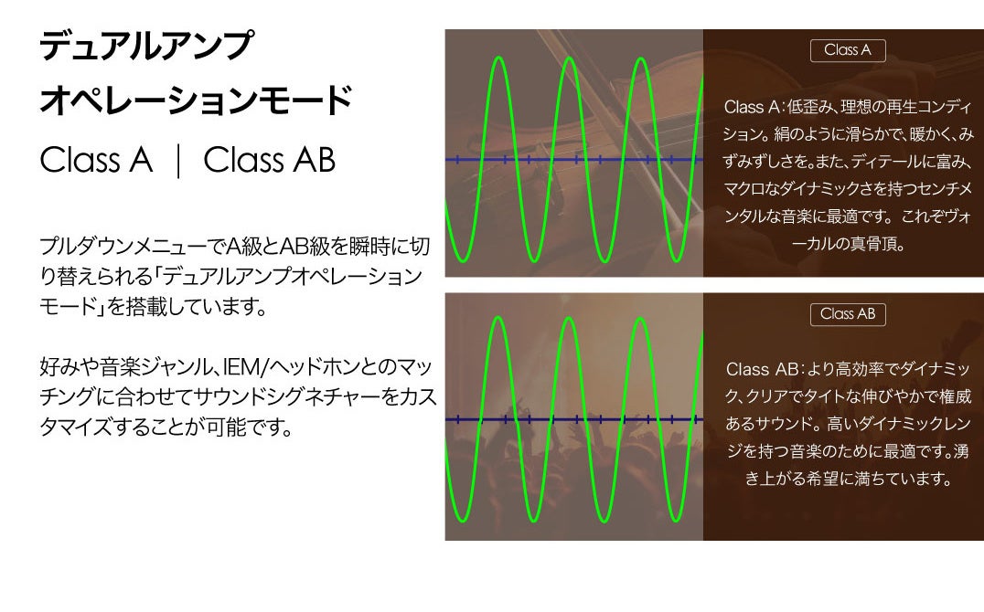 プルダウンメニューでA級とAB級を瞬時に切り替えられる「デュアルアンプオペレーションモード」を搭載しています。好みや音楽ジャンル、IEM/ヘッドホンとのマッチングに合わせてサウンドシグネチャーをカスタマイズすることが可能です。