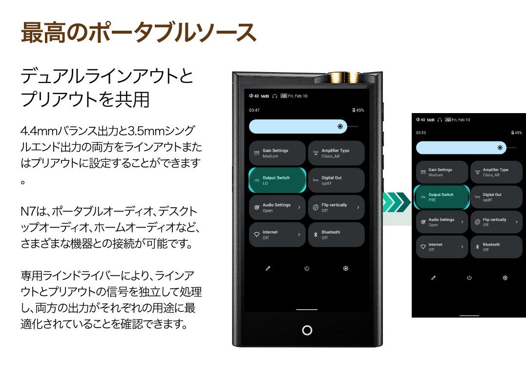 4.4mmバランス出力と3.5mmシングルエンド出力の両方をラインアウトまたはプリアウトに設定することができます。N7は、ポータブルオーディオ、デスクトップオーディオ、ホームオーディオなど、さまざまな機器との接続が可能です。専用ラインドライバーにより、ラインアウトとプリアウトの信号を独立して処理し、両方の出力がそれぞれの用途に最適化されていることを確認できます。