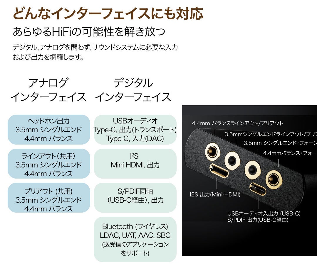 ・デジタルインターフェイス:I2S出力(Mini-HDMI), SPDIF Coaxial出力(USB-C経由), USB Audio入力/出力 (USB-C経由)