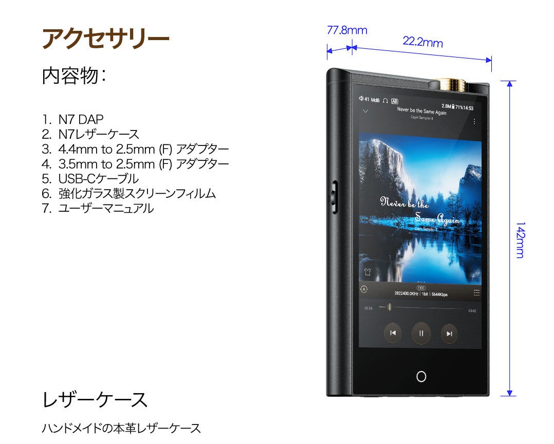 ・充電時間:~5.5時間(5V-2A)、 0%-100%:~4.5時間(Quick Charge PC2.0 9V/2A)※20%-80%は約2時間・同梱品:Cayin N7 マスタークオリティ DAP x 1、ユーザーガイド x 1、強化ガラス製スクリーンプロテクター x 1、Hi-Res オーディオタグ x 1、専用保護ケース x 1、Type-C USB ケーブル x 1、4.4mm to 2.5mm 変換アダプター x 1、3.5mm to 2.5mm 変換アダプター x 1